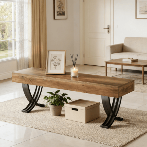 Stylish Bench - Combining rustic and industrial styles, this bench features a textured surface for charm and black X-shaped legs for a unique touch. It's a standout addition to any décor.